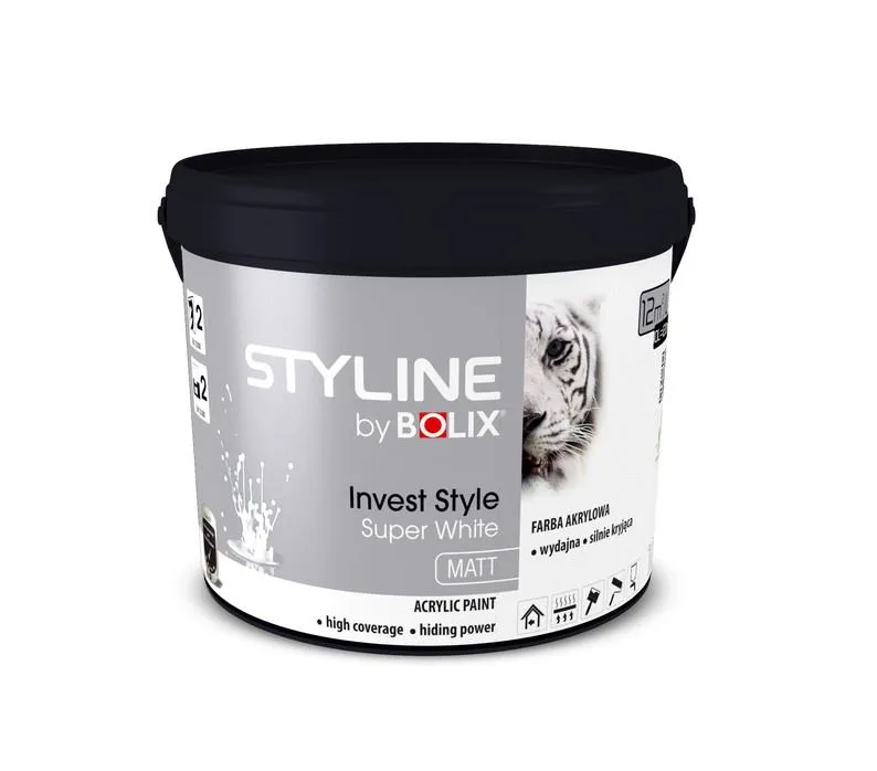 Bolix Styline Invest Style Super White je vysoce kvalitní akrylová barva připravená k okamžitému použití pro interiérové stěny a stropy. Vyznačuje se jasně bílou barvou a vynikající přilnavostí k většině běžných podkladů. Ideální do bytů, domů a kanceláří, nabízí elegantní matný vzhled a dlouhodobou odolnost.