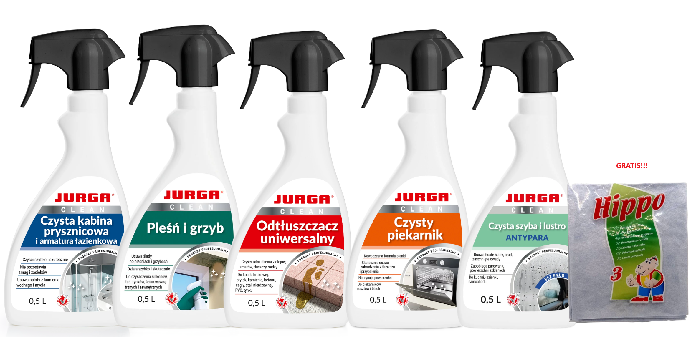 Čisticí sada Jurga Clean obsahuje 5 účinných přípravků pro domácnost a univerzální utěrky zdarma. Pomáhá udržet čistotu v koupelně, kuchyni i na skle a armaturách – bez námahy a s perfektním efektem.