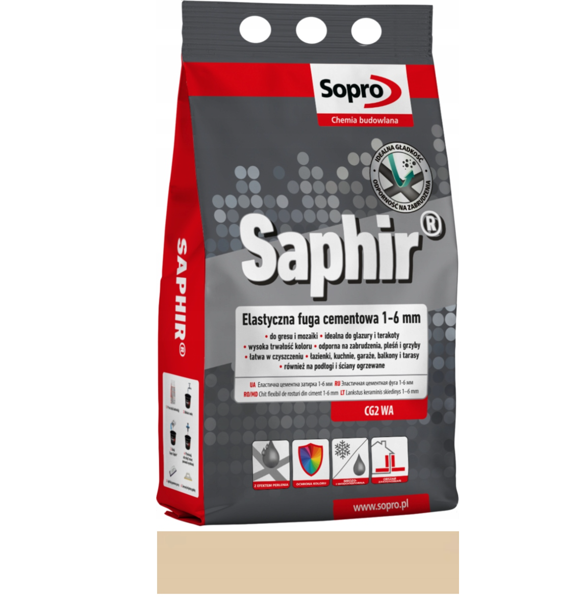Spárovací hmota Sopro Saphir je vysoce kvalitní spárovací malta určená ke spárování keramických obkladů, gresu, klinkeru a přírodního kamene. Produkt byl vyvinut s ohledem na trvanlivé, estetické a vůči nečistotám odolné dokončení obkládaných ploch. Díky moderní technologii výroby zajišťuje spárovací hmota vysokou odolnost proti oděru, vlhkosti i každodennímu používání, což z ní činí ideální řešení jak pro obytné prostory, tak i pro místa s vysokou intenzitou provozu.