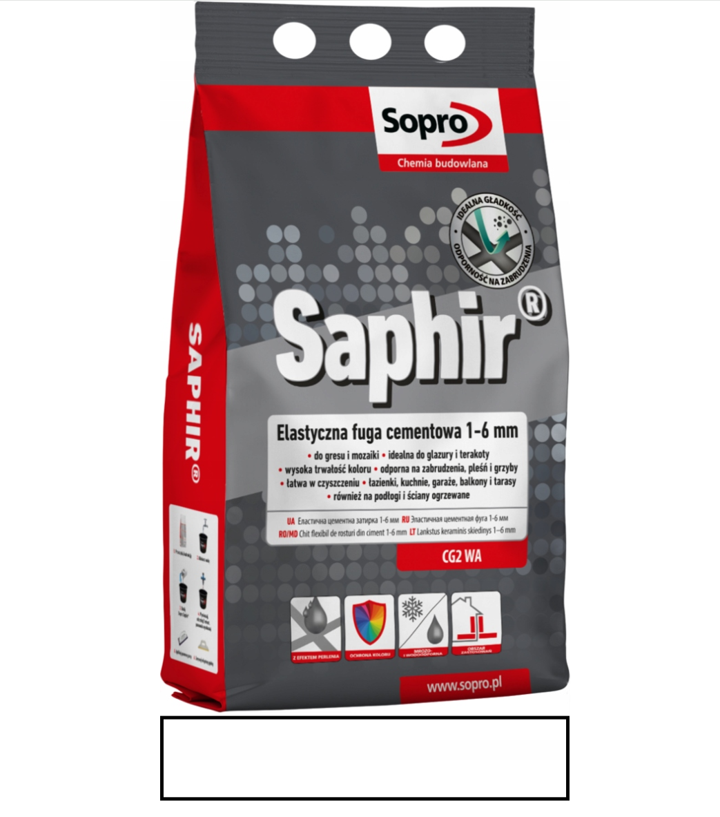 Spárovací hmota Sopro Saphir je vysoce kvalitní spárovací malta určená ke spárování keramických obkladů, gresu, klinkeru a přírodního kamene. Produkt byl vyvinut s ohledem na trvanlivé, estetické a vůči nečistotám odolné dokončení obkládaných ploch. Díky moderní technologii výroby zajišťuje spárovací hmota vysokou odolnost proti oděru, vlhkosti i každodennímu používání, což z ní činí ideální řešení jak pro obytné prostory, tak i pro místa s vysokou intenzitou provozu.