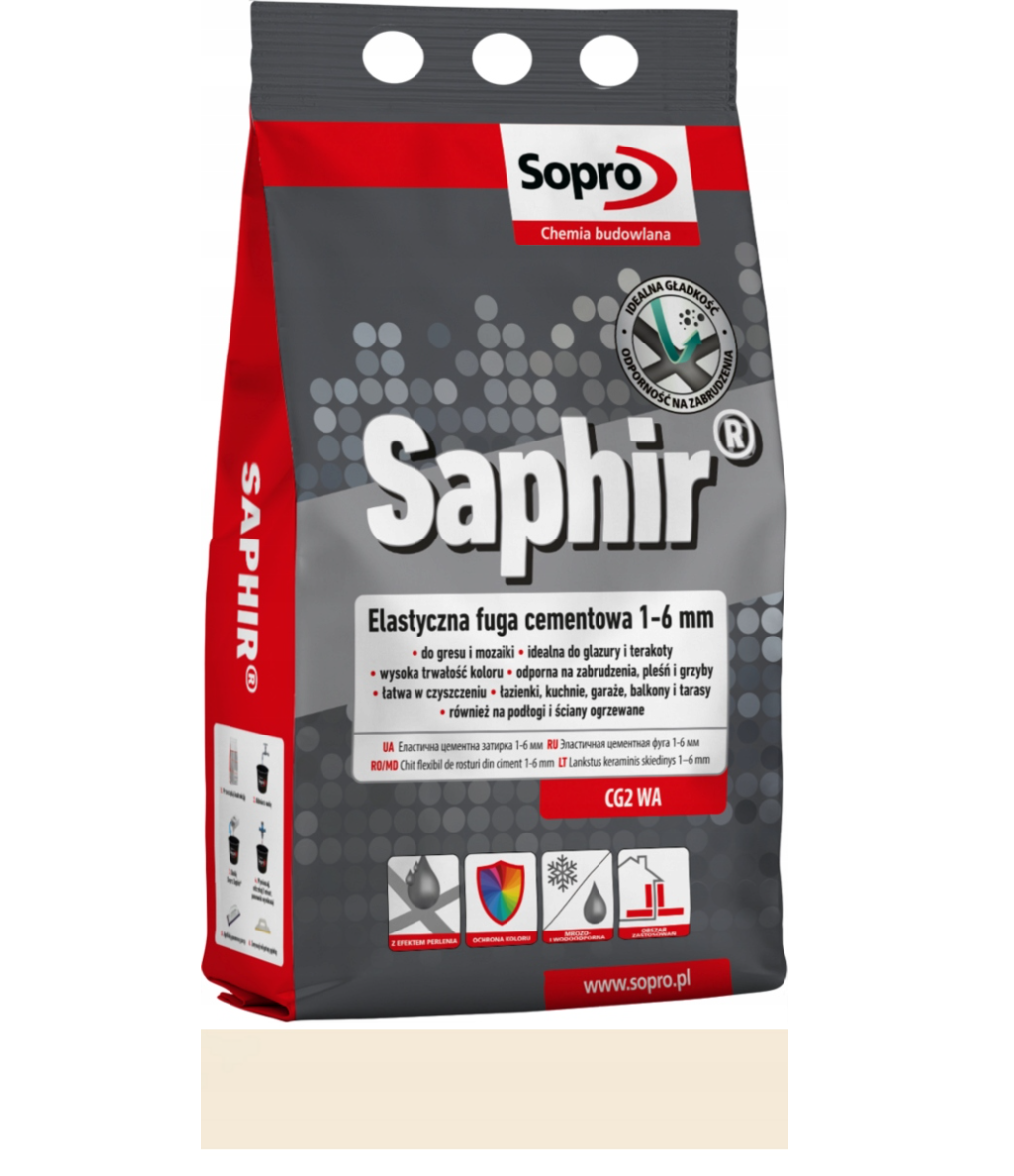 Spárovací hmota Sopro Saphir je vysoce kvalitní spárovací malta určená ke spárování keramických obkladů, gresu, klinkeru a přírodního kamene. Produkt byl vyvinut s ohledem na trvanlivé, estetické a vůči nečistotám odolné dokončení obkládaných ploch. Díky moderní technologii výroby zajišťuje spárovací hmota vysokou odolnost proti oděru, vlhkosti i každodennímu používání, což z ní činí ideální řešení jak pro obytné prostory, tak i pro místa s vysokou intenzitou provozu.