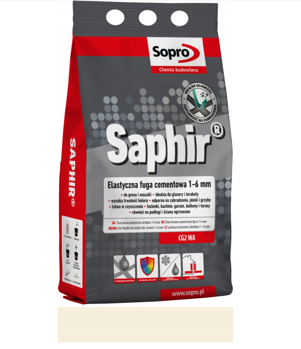 Spárovací hmota Sopro Saphir je vysoce kvalitní spárovací malta určená ke spárování keramických obkladů, gresu, klinkeru a přírodního kamene. Produkt byl vyvinut s ohledem na trvanlivé, estetické a vůči nečistotám odolné dokončení obkládaných ploch. Díky moderní technologii výroby zajišťuje spárovací hmota vysokou odolnost proti oděru, vlhkosti i každodennímu používání, což z ní činí ideální řešení jak pro obytné prostory, tak i pro místa s vysokou intenzitou provozu.