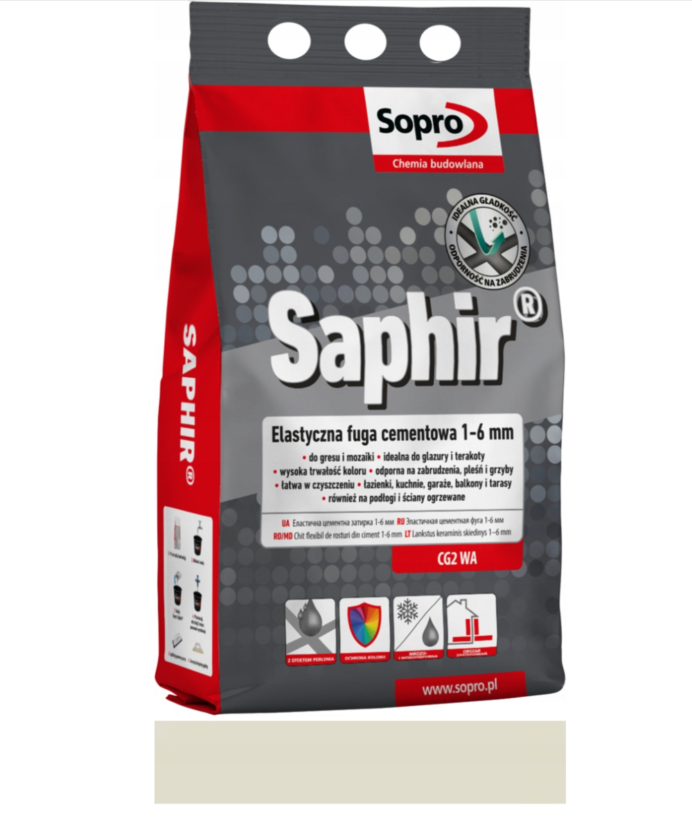 Spárovací hmota Sopro Saphir je vysoce kvalitní spárovací malta určená ke spárování keramických obkladů, gresu, klinkeru a přírodního kamene. Produkt byl vyvinut s ohledem na trvanlivé, estetické a vůči nečistotám odolné dokončení obkládaných ploch. Díky moderní technologii výroby zajišťuje spárovací hmota vysokou odolnost proti oděru, vlhkosti i každodennímu používání, což z ní činí ideální řešení jak pro obytné prostory, tak i pro místa s vysokou intenzitou provozu.