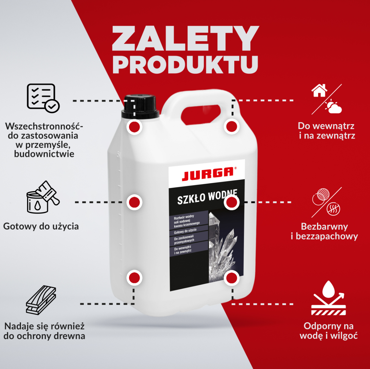 JURGA Vodní sklo je roztok kapalného sodného silikátu, určený k impregnaci, zpevnění a těsnění betonu, omítek a zdiva. Snižuje nasákavost, zvyšuje chemickou a vodní odolnost povrchů a zlepšuje jejich trvanlivost. Lze použít i jako přísadu do cementových směsí pro urychlení tuhnutí a zlepšení vodotěsnosti.
